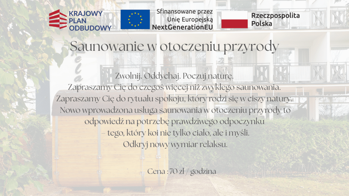Znakomity i komfortowy wypoczynek. Bardzo duża dbałość o klienta ze strony obsługi. Klimatyczny pokój, z przestronną łazienką. Nic dodać nic ująć. Do tego znakomita kuchnia. Śniadanko o niepowtarzalnym smaku ciepłych zimnych przystawek. Polecamy mimo że byliśmy krótko na pewno wrócimy. Dziękujemy